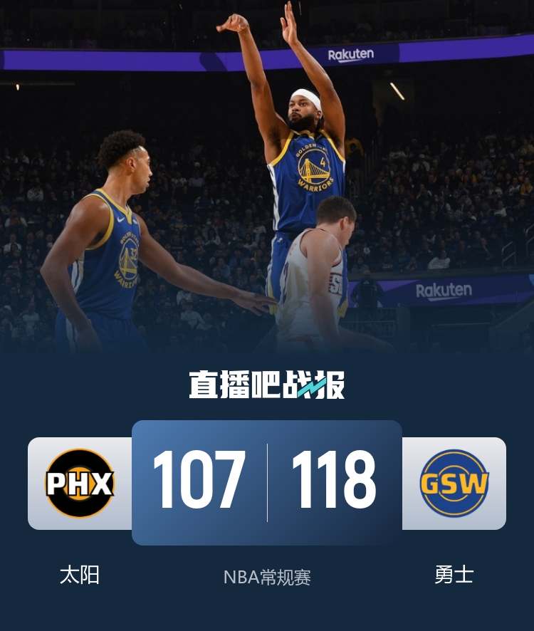 比赛开始,波斯特外线开炮三分3连击,库里和希尔德也锦上添花,勇士持续发力打出12-2的攻击波取得两位数领先,次节穆迪延续火力,内外开花帮助球队继续扩大优势,库里也飙中2记三分,布克依靠个人能力苦苦支撑,半场战罢勇士68-49领先太阳。易边再战,两队围绕20分左右分差展开拉锯战,太阳攻防两端发力打出13-2的攻击波缩小分差,末节穆迪再度开火,连中三分引领球队15-3的攻击波,太阳及时回暖打出10-0续命,但勇士稳扎稳打将优势保持到最后。最终,勇士118-107力克太阳,主场过关。